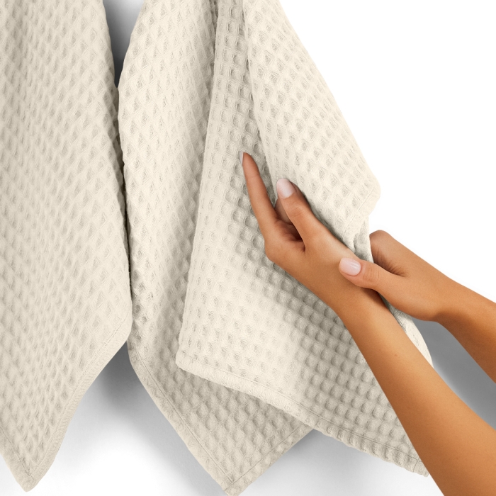 - Завдяки своїй унікальній текстурі, рушники з грецької вафлі мають більшу поверхневу площу, що дозволяє їм швидше висихати порівняно з махровими рушниками.