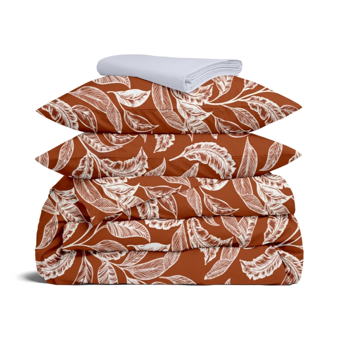 Schnellsuche , , Теракотовий, Листя, Ранфорс, 2х160х220 см, Сімейна постіль з простирадлом на резинці TERRACOTTA