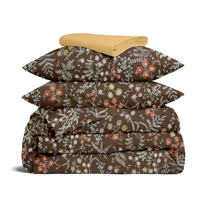 Schnellsuche , , Коричневий, Квіти, Ранфорс, 2х160х220 см, Сімейна постільна білизна з простирадлом на резинці BOTANIC NIGHT
