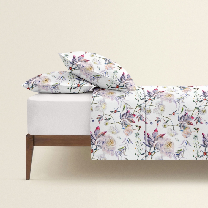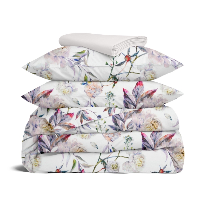 Schnellsuche , , Білий, Квіти, Ранфорс, 180х220 см, Двоспальна постіль з простирадлом на резинці PEONY