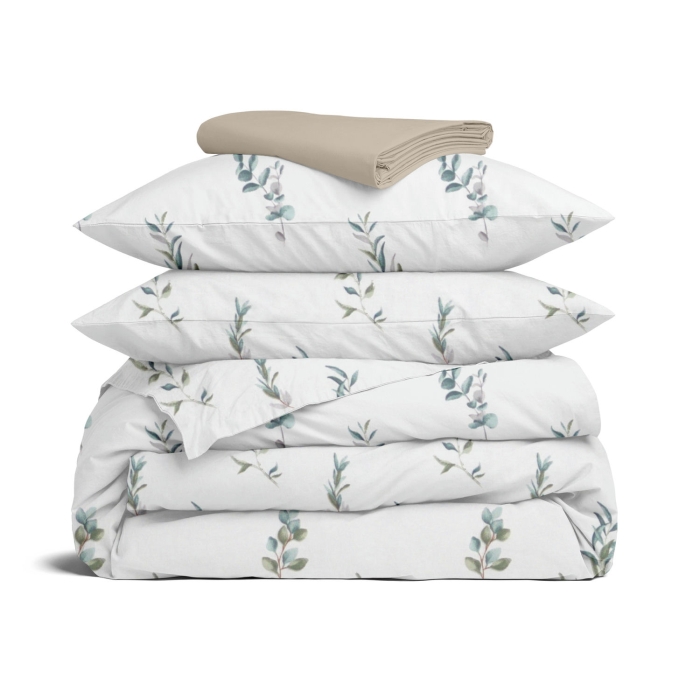 • Практичність: двоспальний комплект включає простирадло з бавовни на резинці, що не ковзає, не мнеться, легко прасується.