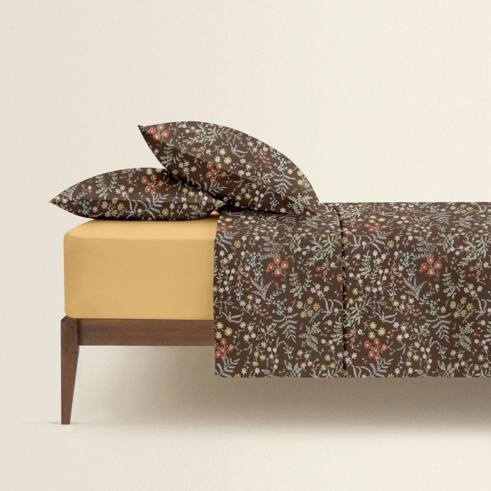 Schnellsuche , , Коричневий, Квіти, Ранфорс, 180х220 см, Двоспальна постільна білизна з простирадлом на резинці BOTANIC NIGHT