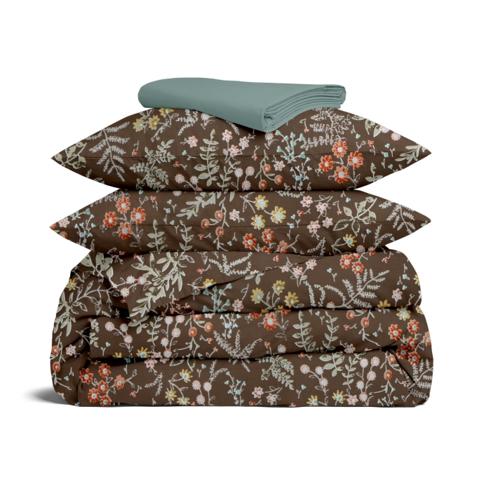 Schnellsuche , , Коричневий, Квіти, Ранфорс, 180х220 см, Двоспальна постільна білизна з простирадлом на резинці BOTANIC NIGHT