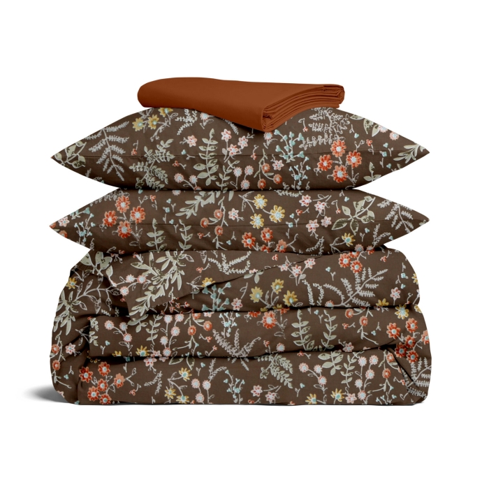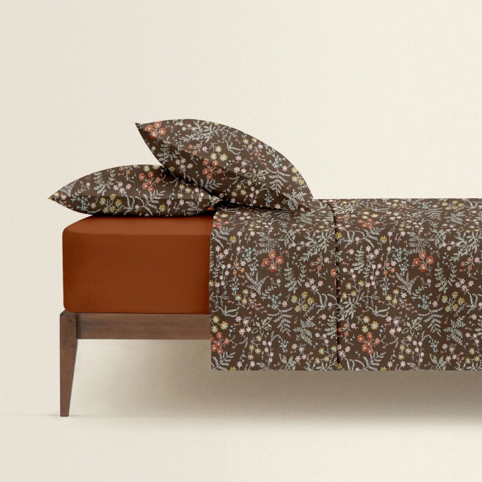 Schnellsuche , , Коричневий, Квіти, Ранфорс, 180х220 см, Двоспальна постільна білизна з простирадлом на резинці BOTANIC NIGHT