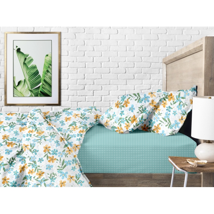 Двоспальна постільна білизна з простирадлом на резинці MINT FLOWERS CS4