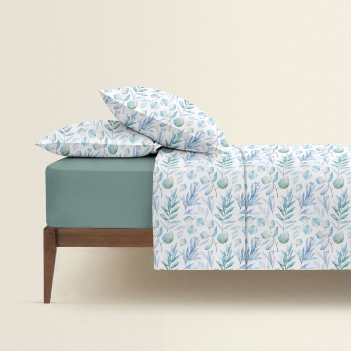 Євро постільна білизна з простирадлом на резинці BLUE LEAVES CS1