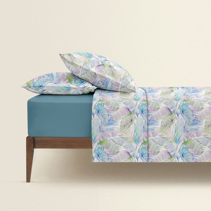 Schnellsuche , , Бірюзовий, Тропіки, Ранфорс, 200х220 см, Євро постіль з простирадлом на резинці PASTEL PALMS