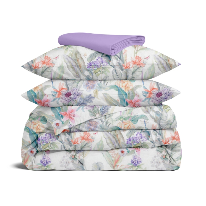 Schnellsuche , , Фіолетовий, Квіти, Ранфорс, 200х220 см, Євро постіль з простирадлом на резинці TROPICAL FLOWERS