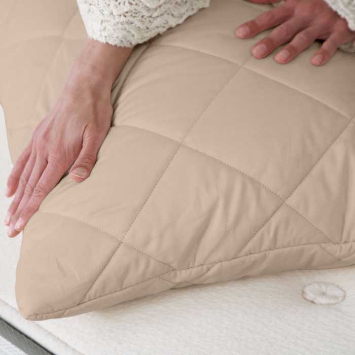 Чохол на подушку простьобаний з двох сторін, має антиалергенний наповнювач - синтепух, зносостійкий, невибагливий у використанні. Тканина зберігає тепло, дає тілу можливість дихати, не викликає алергії.