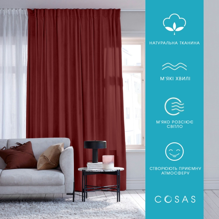 • Стильний дизайн: однотонні штори COSAS підкреслять загальний стиль будь-якої кімнати, візуально розширять вікно та збільшать висоту стелі.