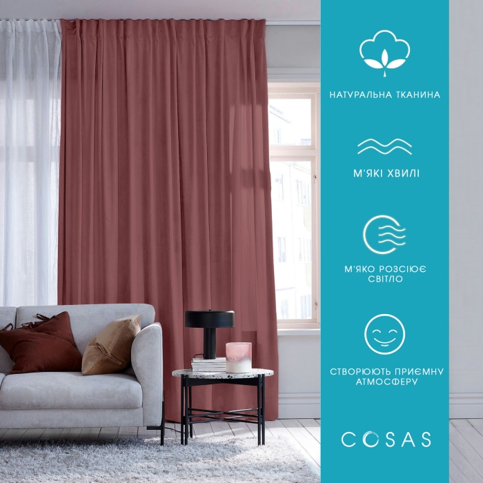 • Чистота та краса: на відміну від синтетичних штор, штори COSAS не збирають пил, роблячи їх ідеальним вибором для людей з алергією та тих, хто піклується про чистоту свого дому.
