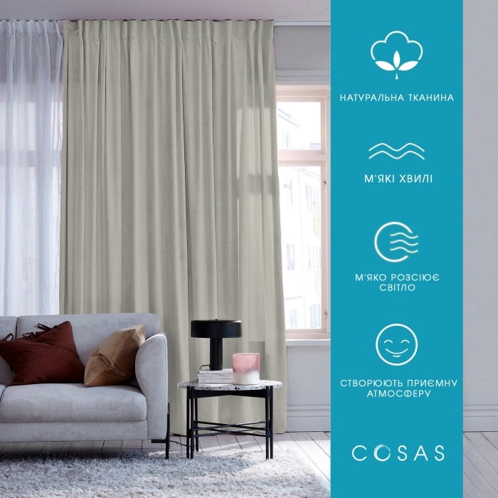 • Зносостійкість: штори COSAS виготовлені з якісних матеріалів і прослужать вам довгі роки.