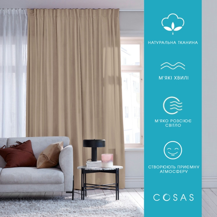 • Зносостійкість: штори COSAS виготовлені з якісних матеріалів і прослужать вам довгі роки.