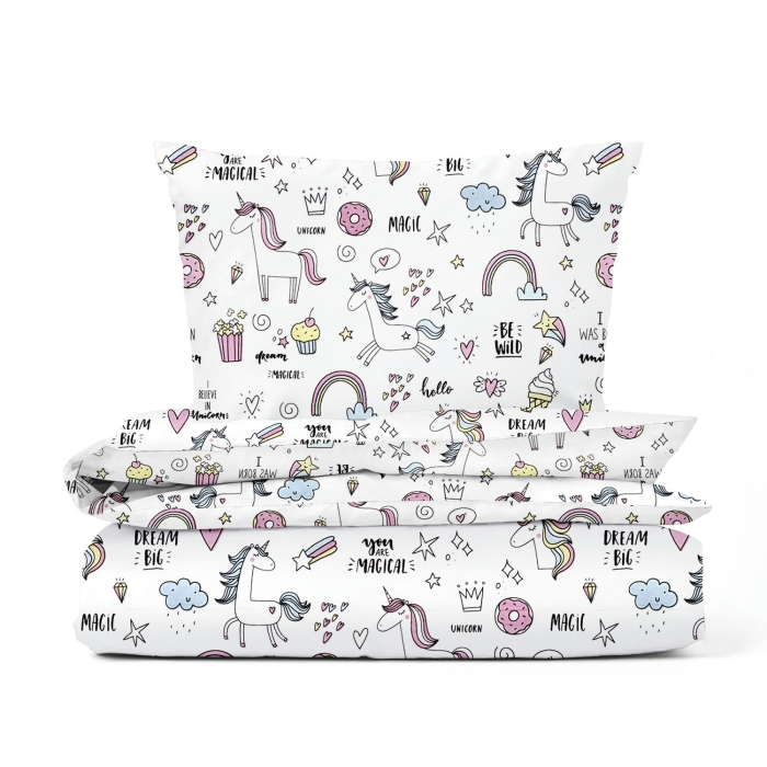 Теги: , Білі єдинороги з різнокольоровими солодощами ранфорс 240 см T 7017, Білий, Єдинороги, Ранфорс, 110х140 см, Дитяча постіль без простирадла UNICORN SWEET