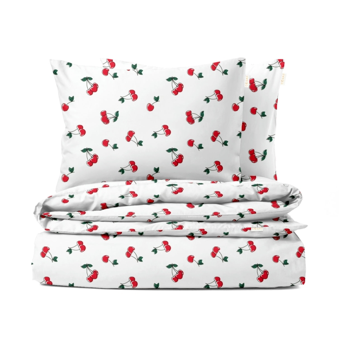 Теги: , Ягідки вишні на плодоніжках з зеленими листочками на білому, Червоний, Природа, Ранфорс, 180х220 см, Двоспальний комплект без простирадла CHERRY
