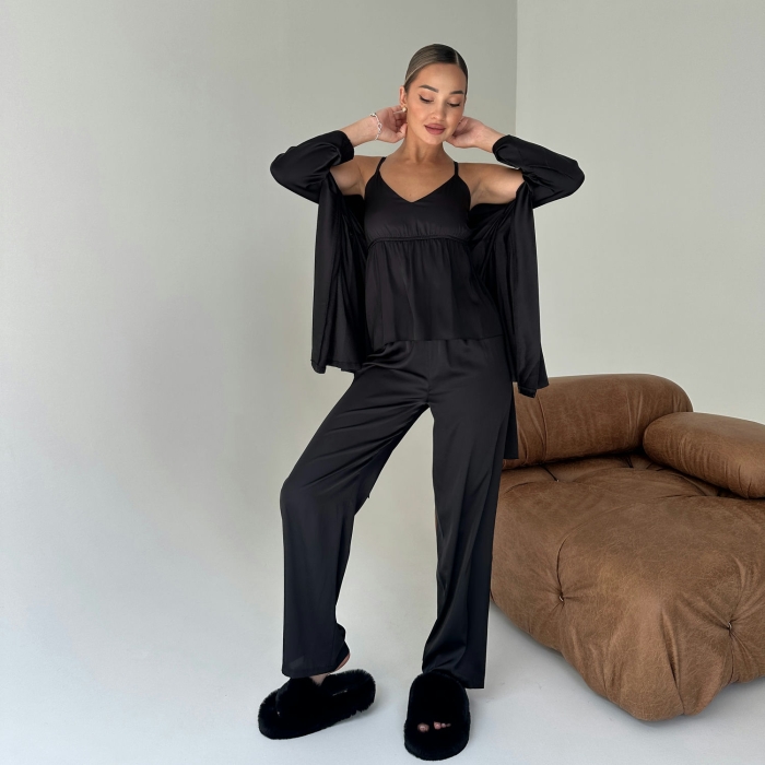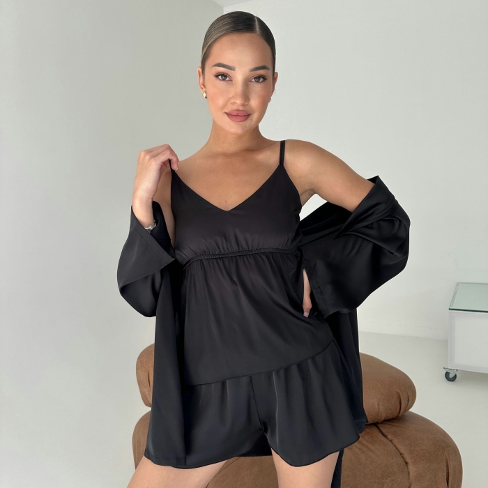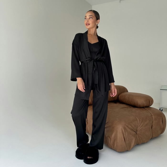 Домашній комплект складається з чотирьох елементів: шовкового халата, майки, шортів та довгих штанів. Кожна деталь цього комплекту створена для того, щоб ви відчували себе особливою навіть вдома.