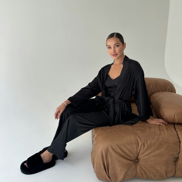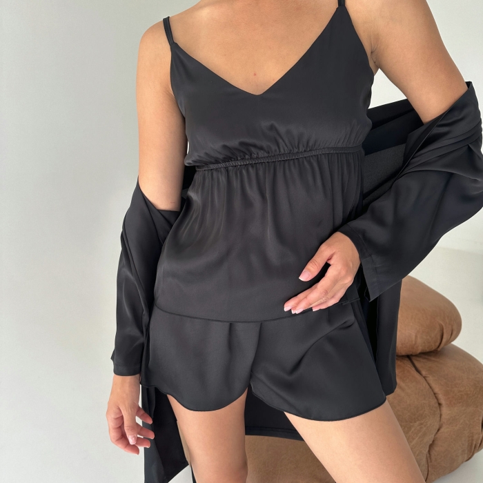 Домашній комплект складається з чотирьох елементів: шовкового халата, майки, шортів та довгих штанів. Кожна деталь цього комплекту створена для того, щоб ви відчували себе особливою навіть вдома.