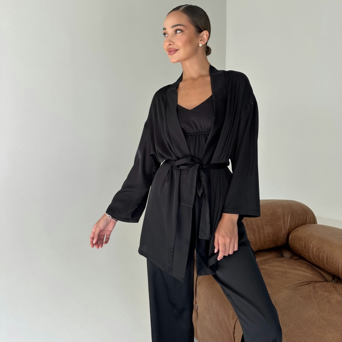 • Шовковий халат: елегантний фасон довжиною 75 см, що додає витонченості.