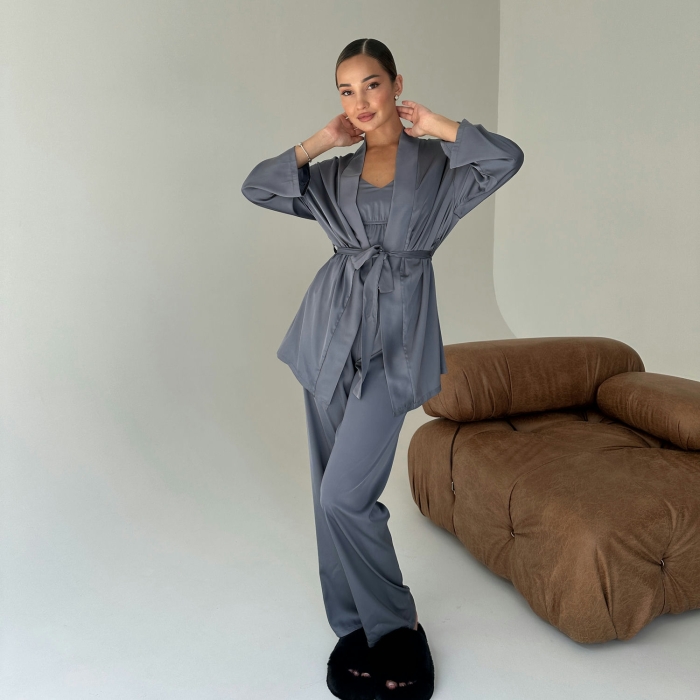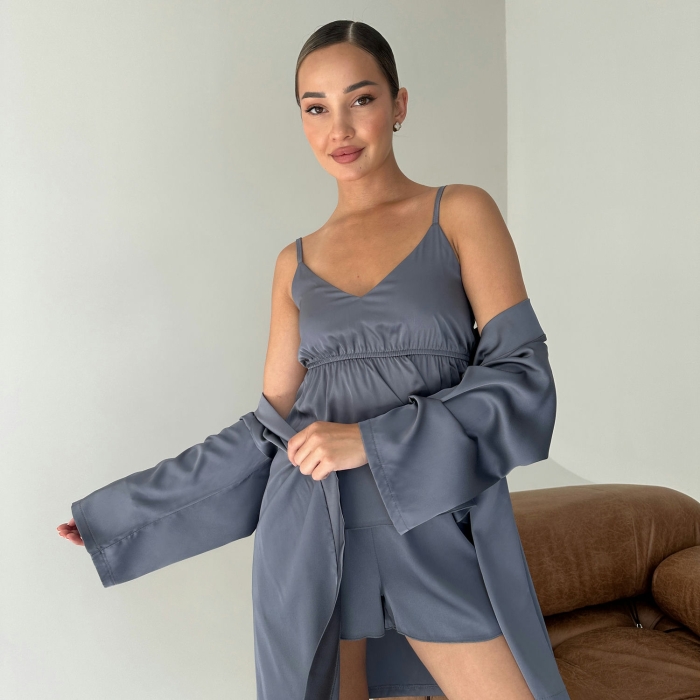 Домашній комплект складається з чотирьох елементів: шовкового халата, майки, шортів та довгих штанів. Кожна деталь цього комплекту створена для того, щоб ви відчували себе особливою навіть вдома.