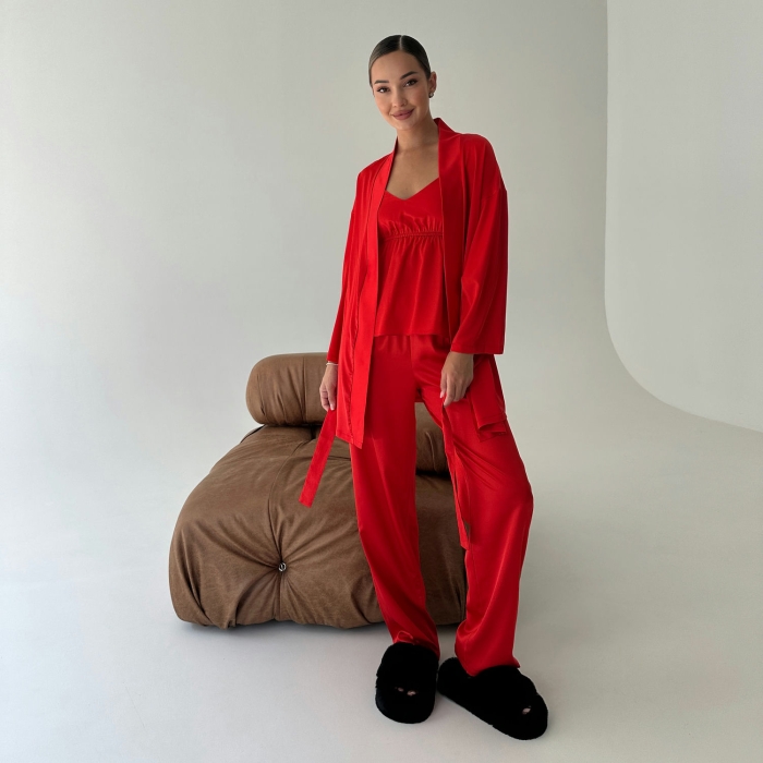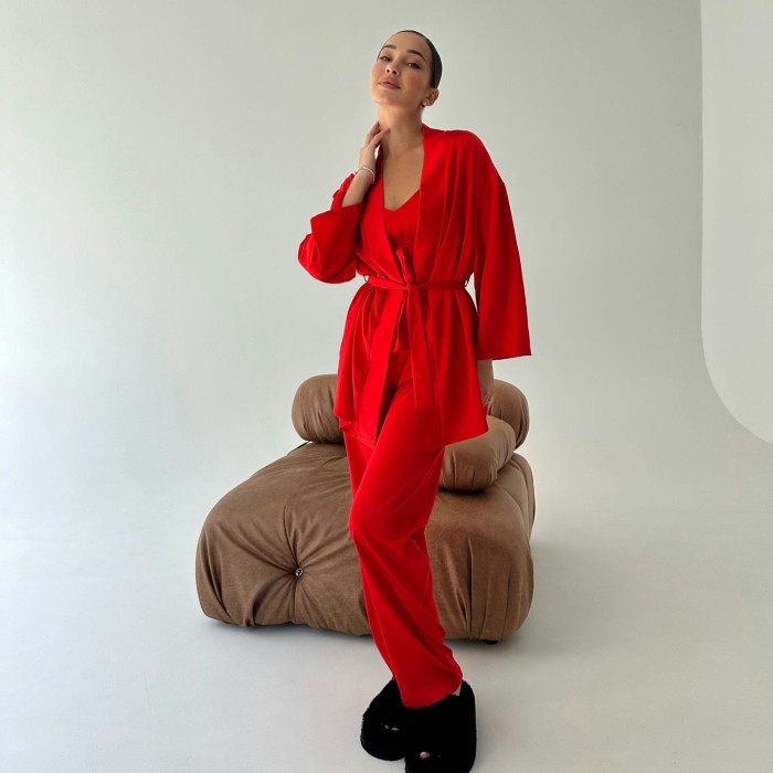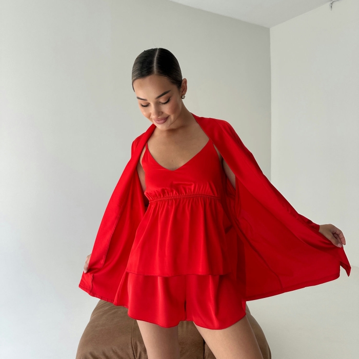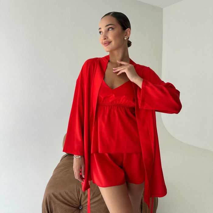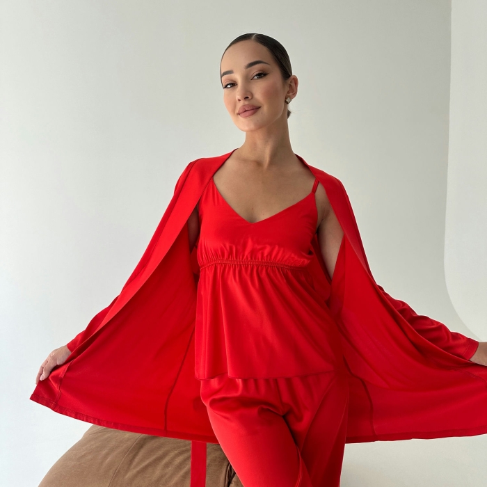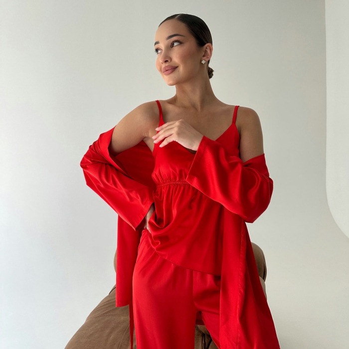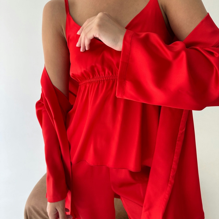 Домашній комплект складається з чотирьох елементів: шовкового халата, майки, шортів та довгих штанів. Кожна деталь цього комплекту створена для того, щоб ви відчували себе особливою навіть вдома.