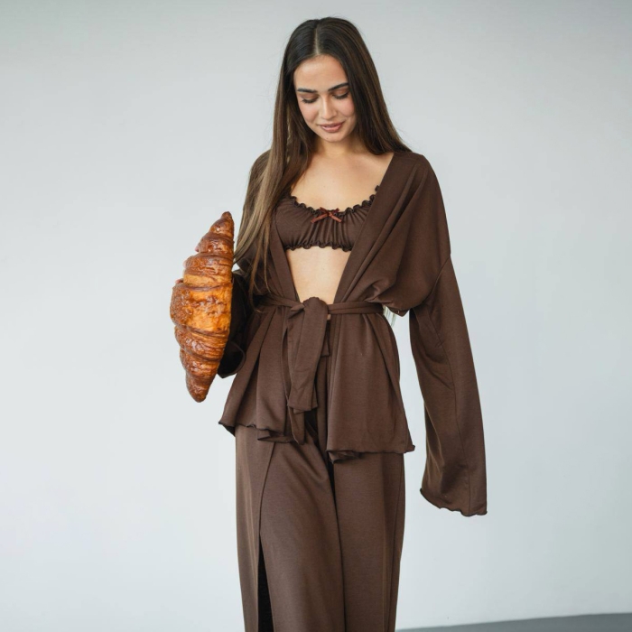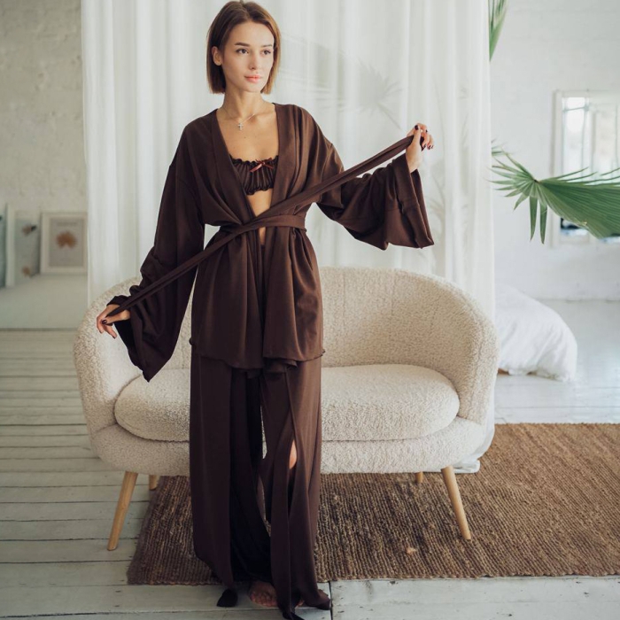 Комплект включає три елегантні елементи: халат із широкими рукавами, зручний ліф без чашечок із резинчастою основою на застібці та вільного крою довгі штани із розрізами спереду.