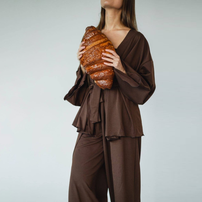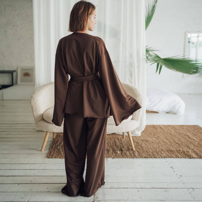• Стильний крій і свобода рухів: халат із широкими рукавами додає жіночності та легкості, а вільні штани з розрізами спереду забезпечують максимальну зручність.
