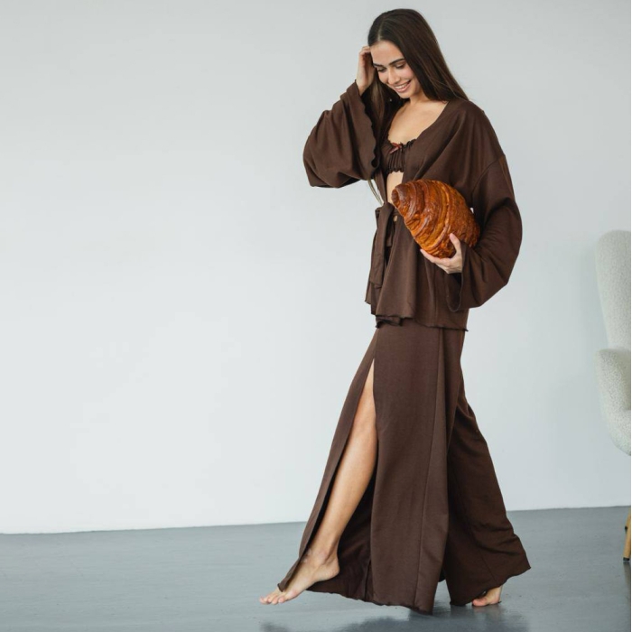 • Стильний крій і свобода рухів: халат із широкими рукавами додає жіночності та легкості, а вільні штани з розрізами спереду забезпечують максимальну зручність.