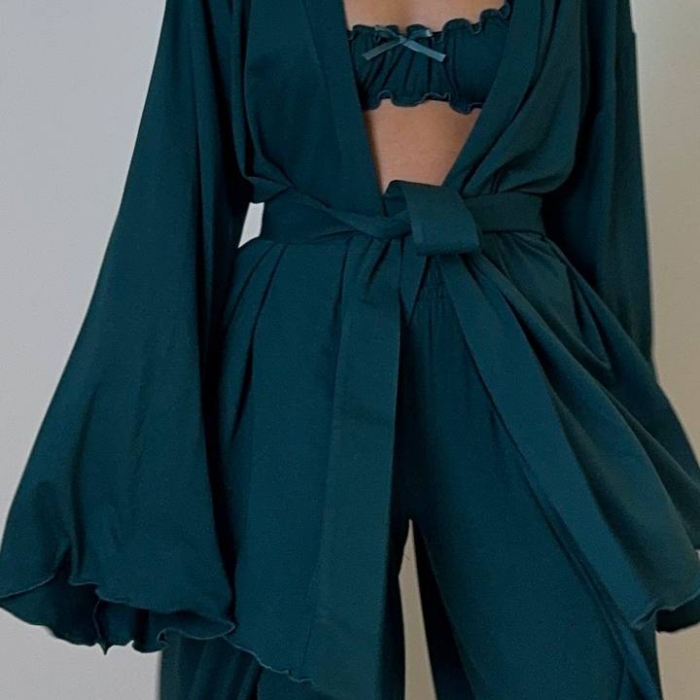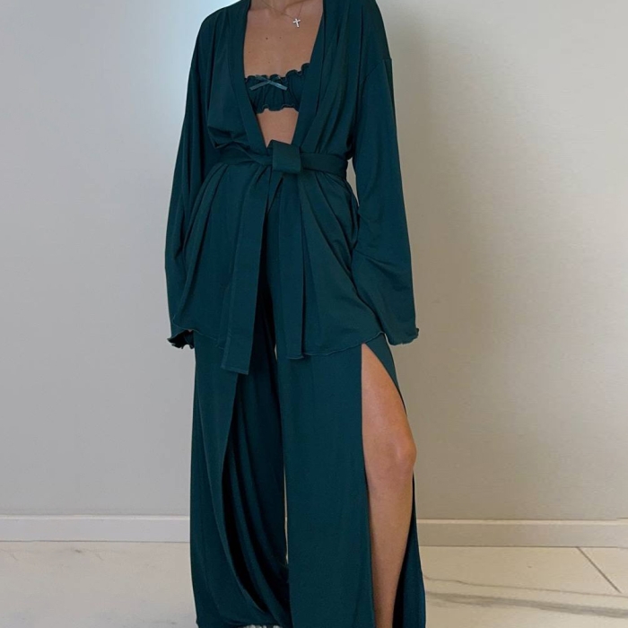 Комплект включає три елегантні елементи: халат із широкими рукавами, зручний ліф без чашечок із резинчастою основою на застібці та вільного крою довгі штани із розрізами спереду.