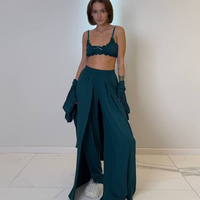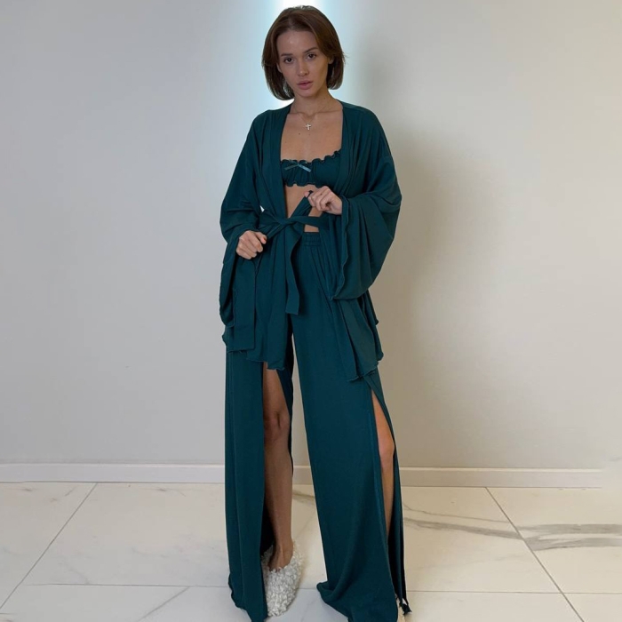 Комплект включає три елегантні елементи: халат із широкими рукавами, зручний ліф без чашечок із резинчастою основою на застібці та вільного крою довгі штани із розрізами спереду.