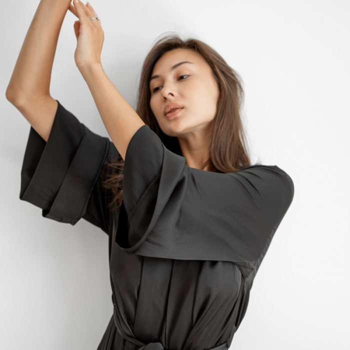 • Ідеальний крій – халат має довгі широкі рукави та зав’язується поясом, що дозволяє регулювати посадку за бажанням.
