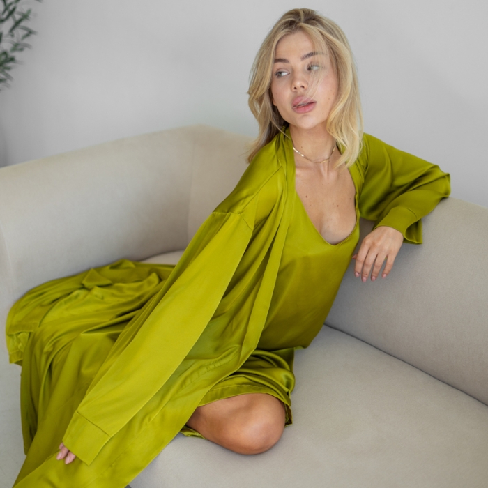 • Максі-довжина – довгий шовковий халат вишукано облягає силует, надаючи особливого шарму та грації.