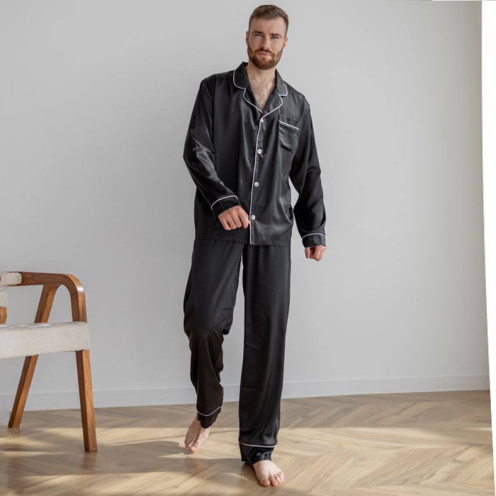 - Натуральна тканина – якісний шовк піжами, дарує ніжність і легкість на шкірі. Матеріал не викликає подразнень, що особливо важливо для чоловіків із чутливою шкірою.