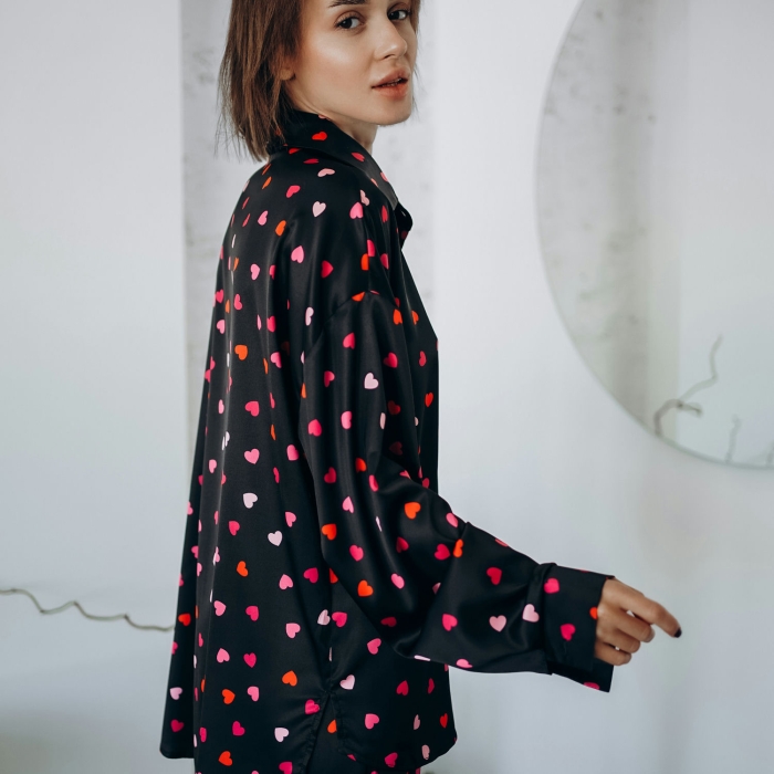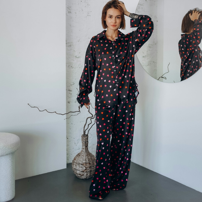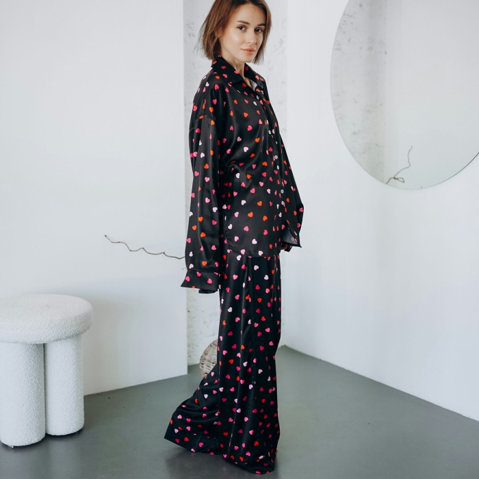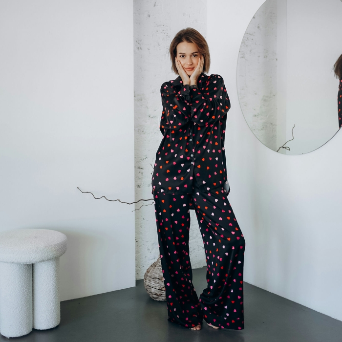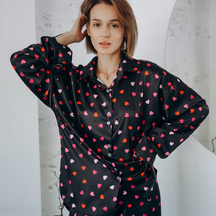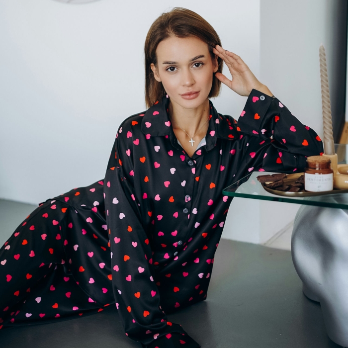 Легка сатинова тканина з шовковистою текстурою приємно торкається шкіри, забезпечуючи комфортний сон і затишок удома. Романтичний принт із кольоровими сердечками додає піжамі особливого шарму.