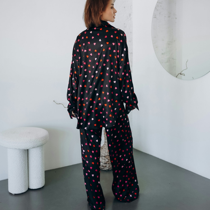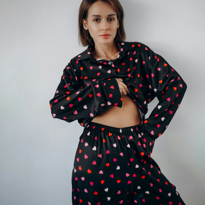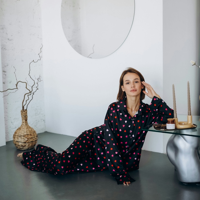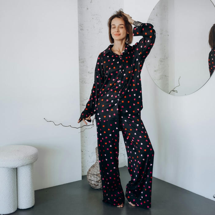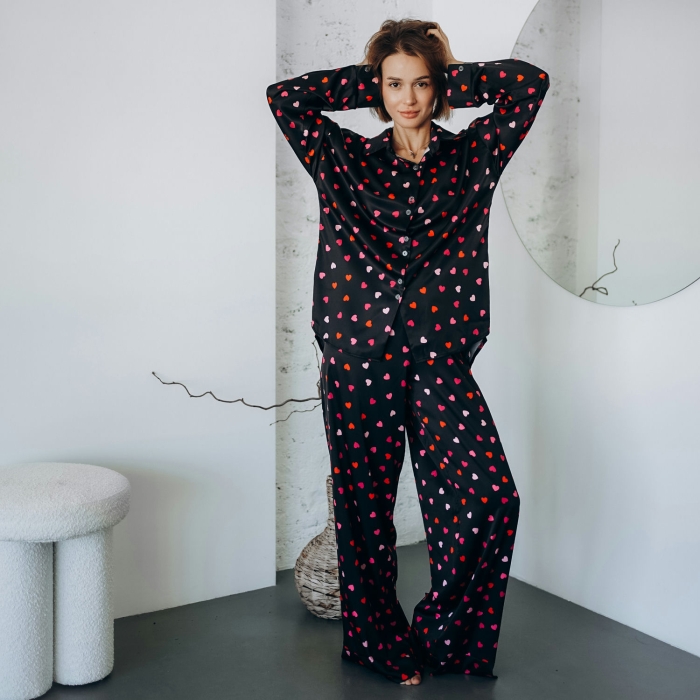 Легка сатинова тканина з шовковистою текстурою приємно торкається шкіри, забезпечуючи комфортний сон і затишок удома. Романтичний принт із кольоровими сердечками додає піжамі особливого шарму.