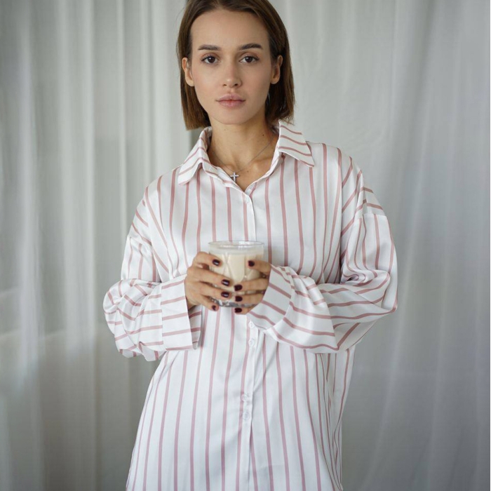 • Сорочка на ґудзиках – класичний дизайн із довгими рукавами та манжетами, які підкреслюють витонченість моделі.