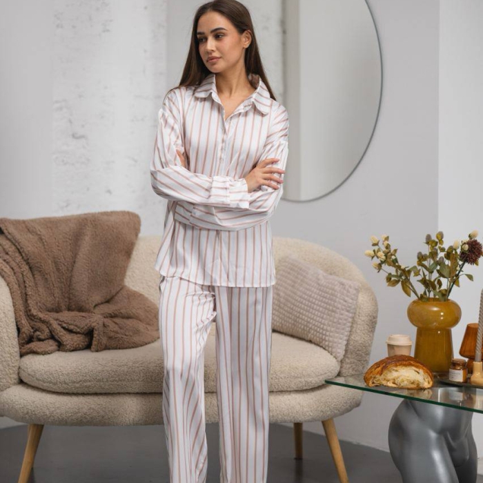 Tessa – це вишукана жіноча піжама в смужку, яка поєднує шикарний вигляд, комфорт та якість. Виготовлена з натурального шовкового сатину, вона ніжно торкається шкіри, даруючи приємні відчуття та абсолютний комфорт.