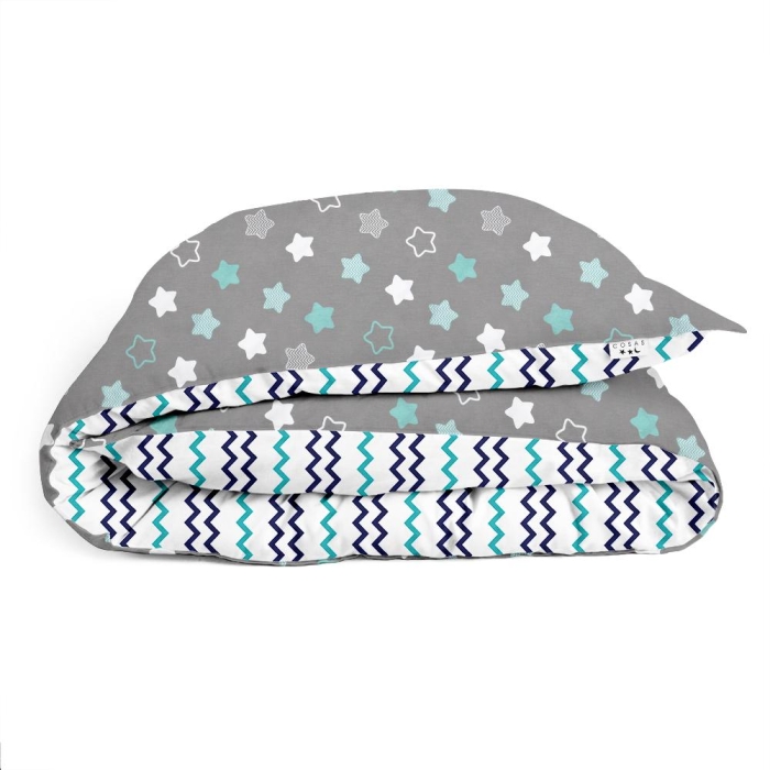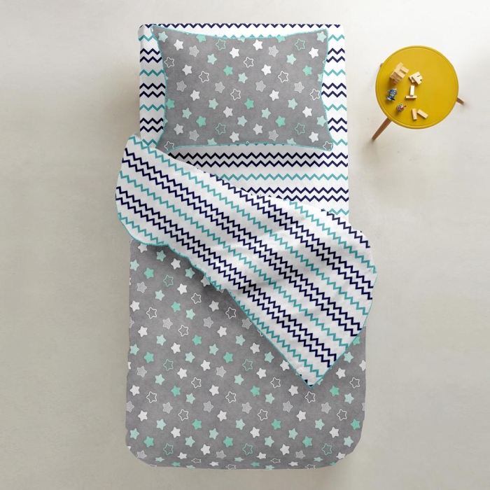 Теги: , Зірки (пряники) білі, м’ятні на сірому PL/10050, Зигзаг Синьо-бірюзовий на білому (морський) PL, М'ята, Зорі, Ранфорс, 110х140 см, Підковдра дитяча 110х140 MINT STARS