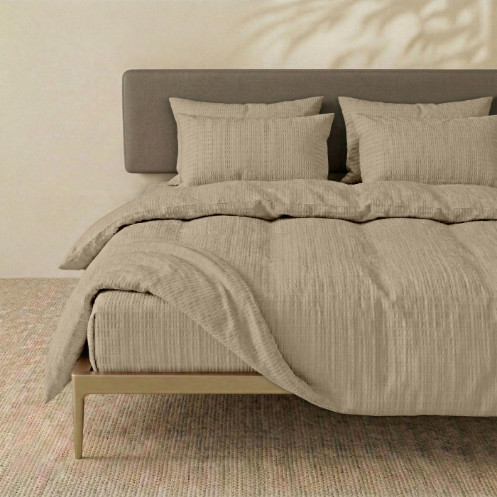 Комплекти COSAS виготовлені зі 100% натуральної текстурованої бавовни (жатка) — м’якої, повітропроникної та приємної на дотик тканини з легкою рельєфною фактурою.
