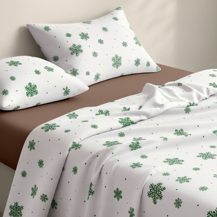 Двоспальна постільна білизна фланель з простирадлом на резинці SNOWFLAKES EVERGREEN CS7