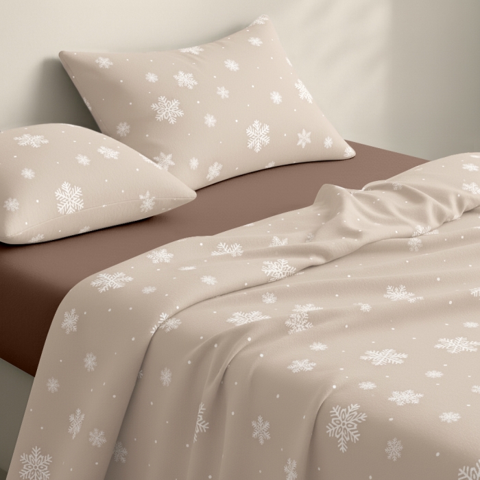 Двоспальна постільна білизна фланель з простирадлом на резинці SNOWFLAKES LATTE CS2