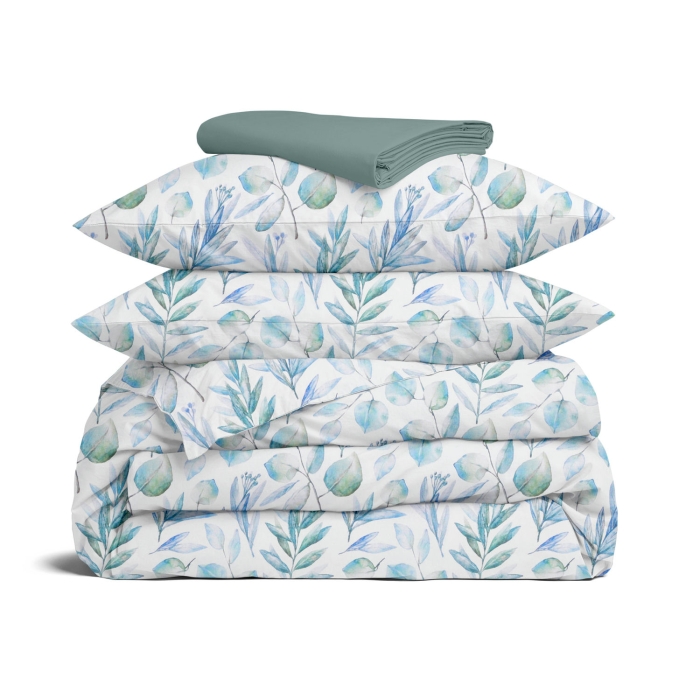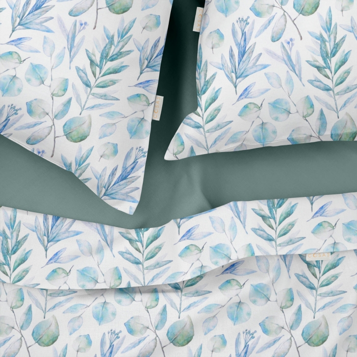 Двоспальна постільна білизна з простирадлом на резинці BLUE LEAVES