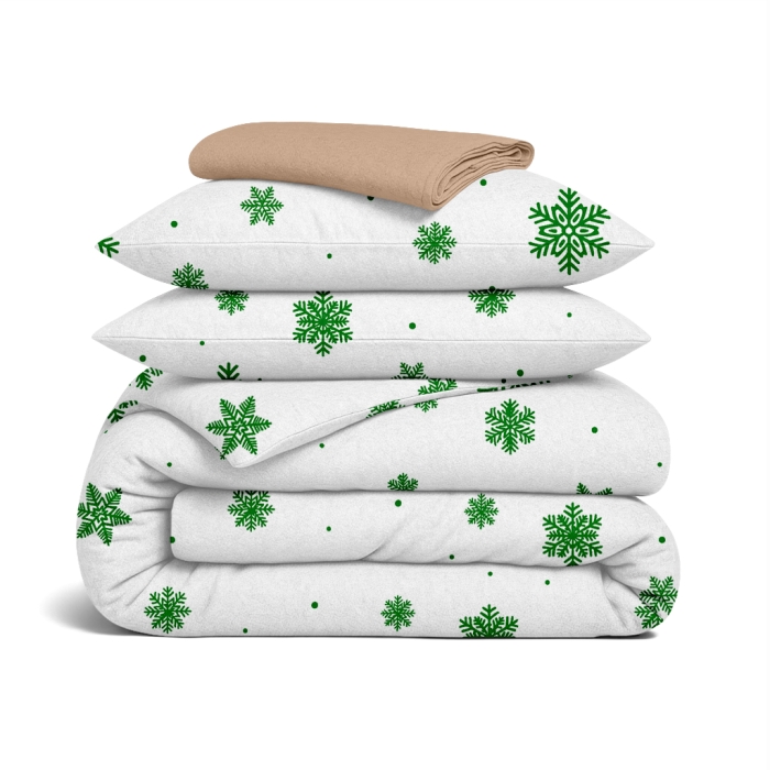 Євро постільна білизна фланель з простирадлом на резинці SNOWFLAKES EVERGREEN CS6