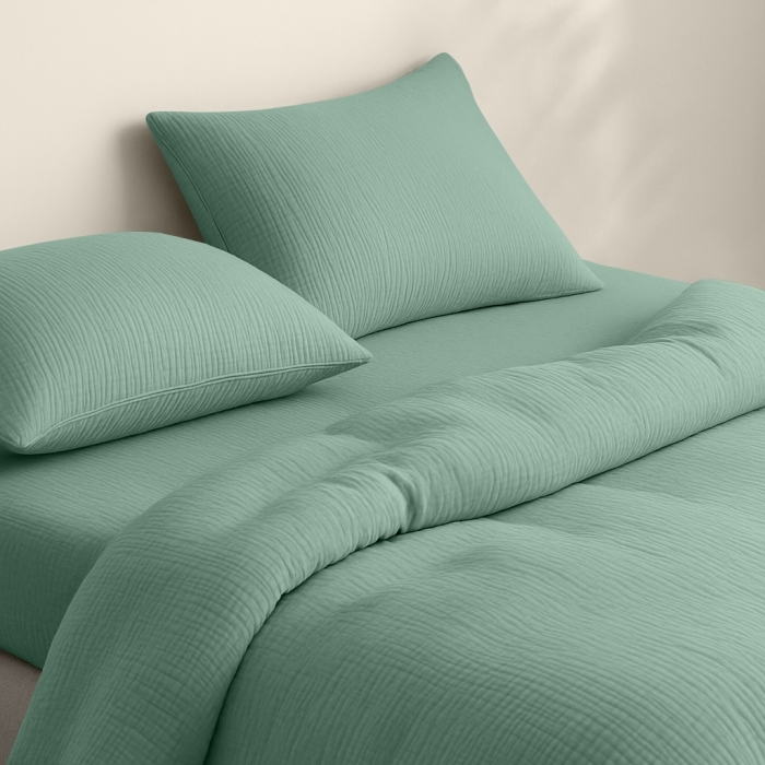 Сімейний комплект постільної білизни на резинці COSAS з 4-шарового мусліну — запорука здорового та комфортного сну.