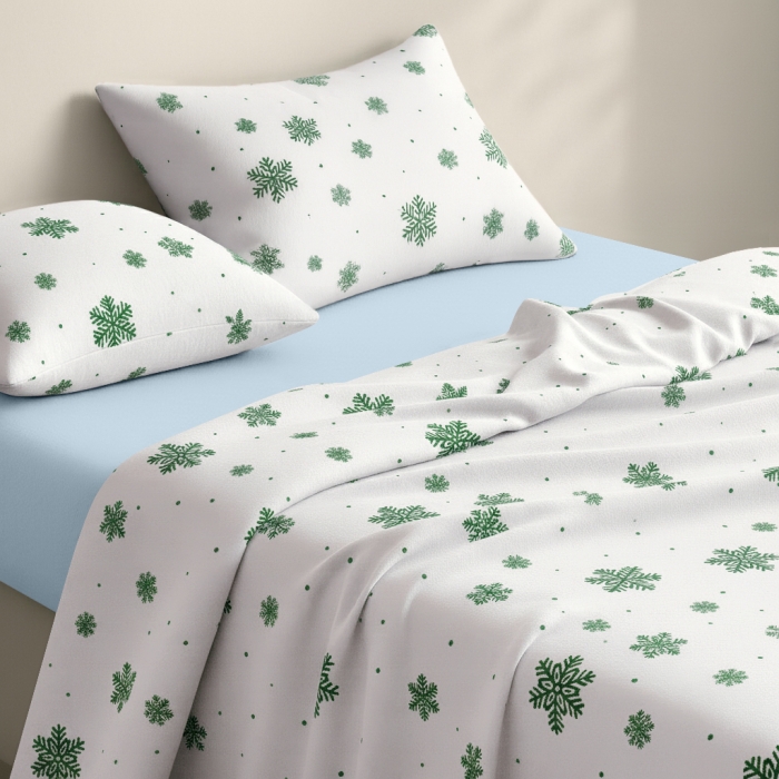 Сімейний комплект фланель з простирадлом на резинці SNOWFLAKES EVERGREEN