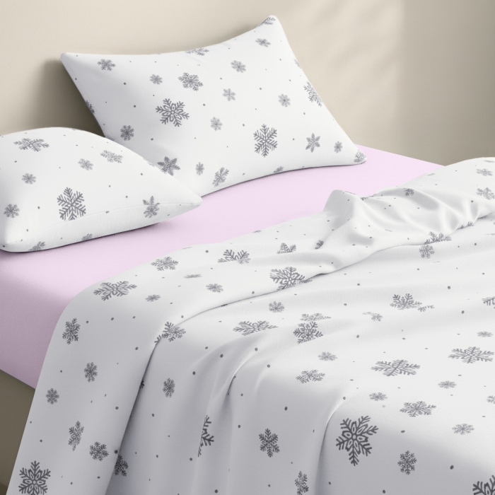 Сімейний комплект фланель з простирадлом на резинці SNOWFLAKES SILVER CS5