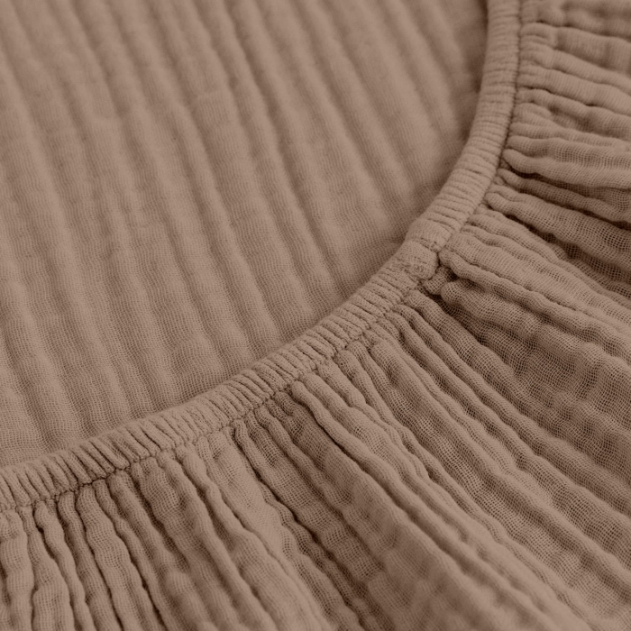 Полуторне простирадло на резинці COSAS 140×200×20 см виготовлене зі 100% натурального 4-шарового мусліну — м’якої, дихаючої та делікатної тканини, що створює відчуття природної легкості та затишку щодня.