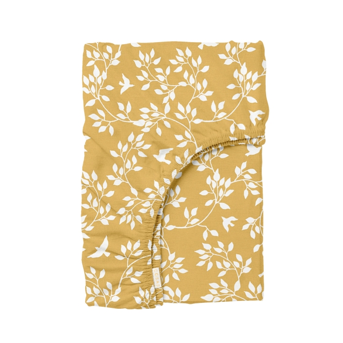 Теги: , Пташки літають між гілками білі на гірчичному, Гірчичний, Квіти, Ранфорс, 150х200х20 см, Простирадло на резинці 150x200 FLORET