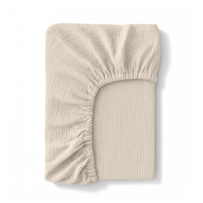 Виготовлене з ніжного 4-шарового мусліну — 100% натуральної бавовни. Муслінове простирадло м’яке, повітряне та приємне на дотик. Тканина добре дихає, не парить, не подразнює шкіру та зберігає м’якість навіть після багаторазового прання. Завдяки природній текстурі не потребує прасування.