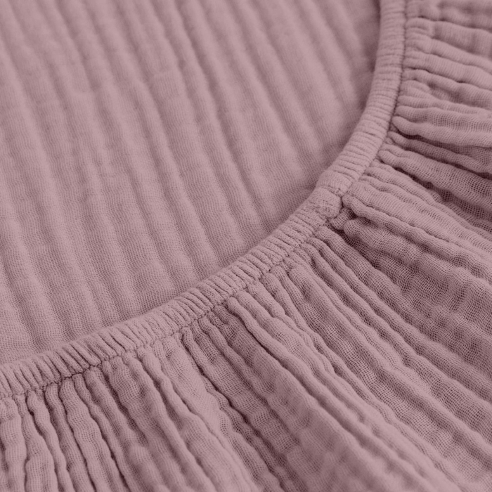 Виготовлене з ніжного 4-шарового мусліну — 100% натуральної бавовни. Муслінове простирадло м’яке, повітряне та приємне на дотик. Тканина добре дихає, не парить, не подразнює шкіру та зберігає м’якість навіть після багаторазового прання. Завдяки природній текстурі не потребує прасування.